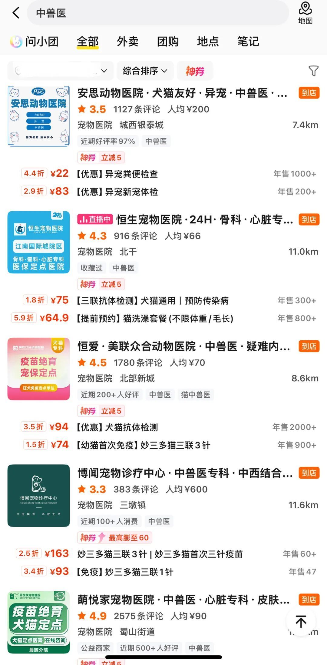记者在某生活类APP搜索关键词“中兽医”,出现了多家宠物诊疗机构。