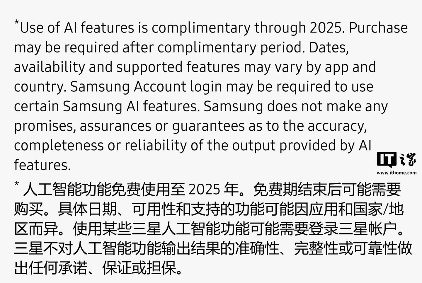 三星 Galaxy AI 海外官网此前条款为“AI 功能免费使用期截至 2025 年底”,而最新修改后条款为“三星提供的 Galaxy AI 基本功能免费”。IT之家查询三星中国官网,标注为:
