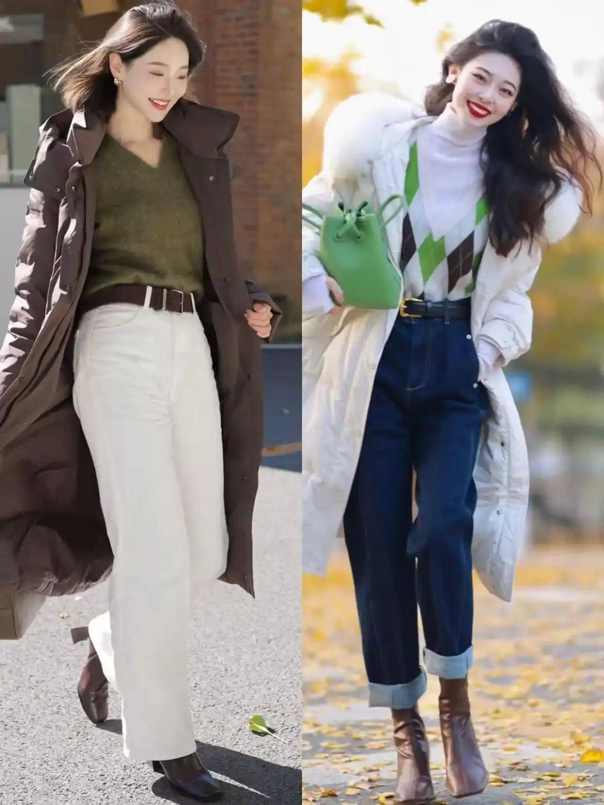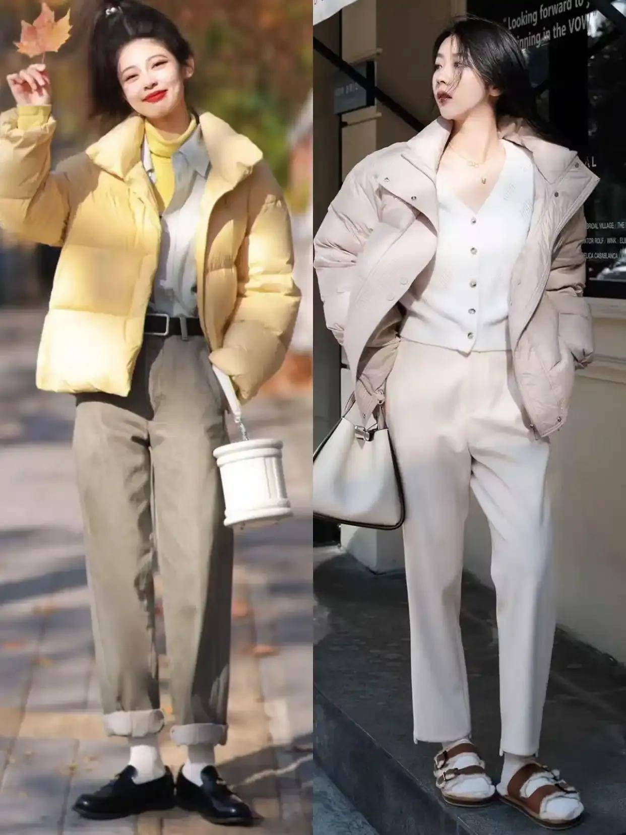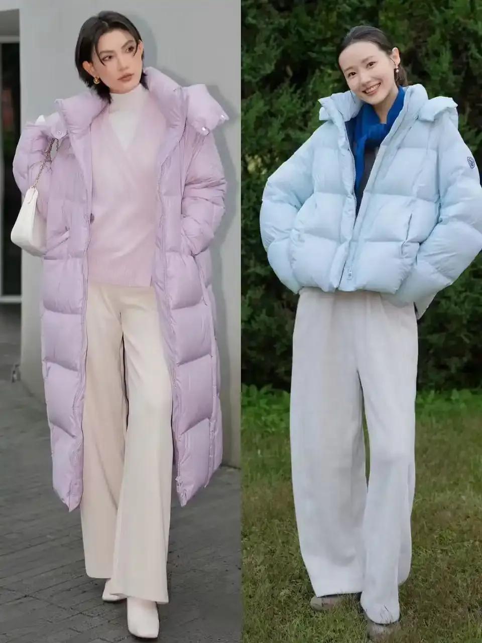 想要穿出轻熟风,我个人还是蛮推荐你选择西装裤的,西装面料的裤子穿在身上挺括有型,很遮肉显瘦,而且比较干练,搭配上一件浅蓝色的羽绒服或者是浅粉色的长款羽绒服,都能很好的穿出轻熟风的时尚感。