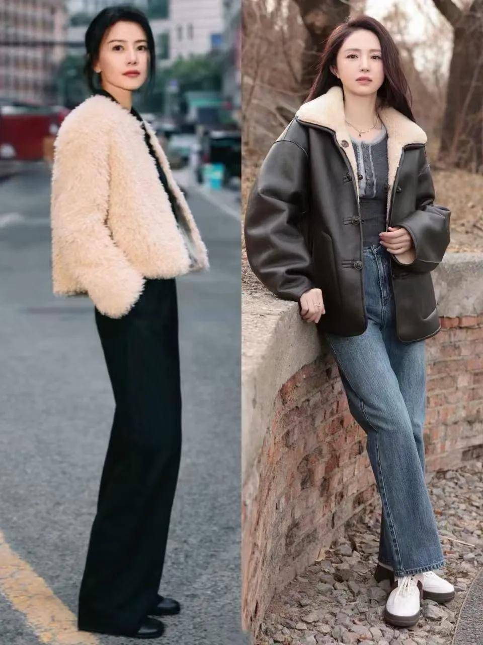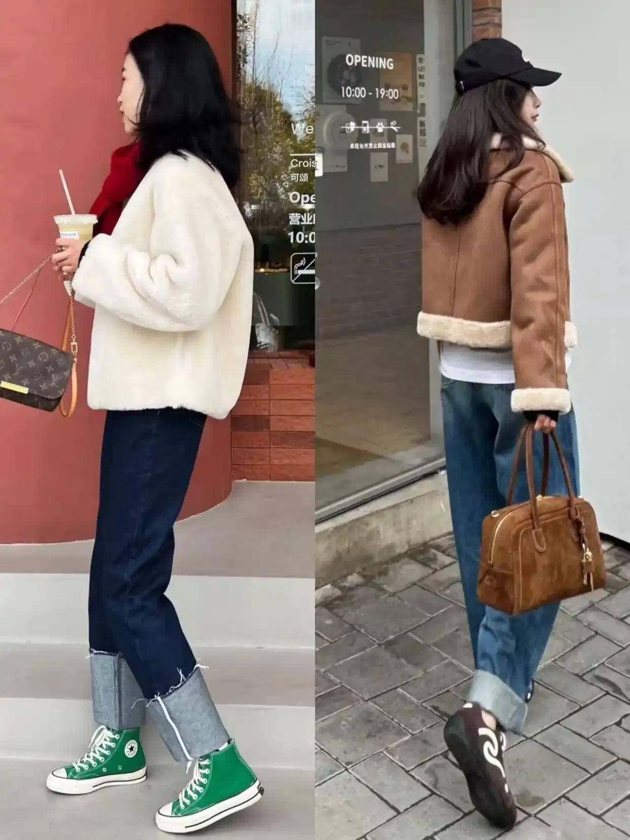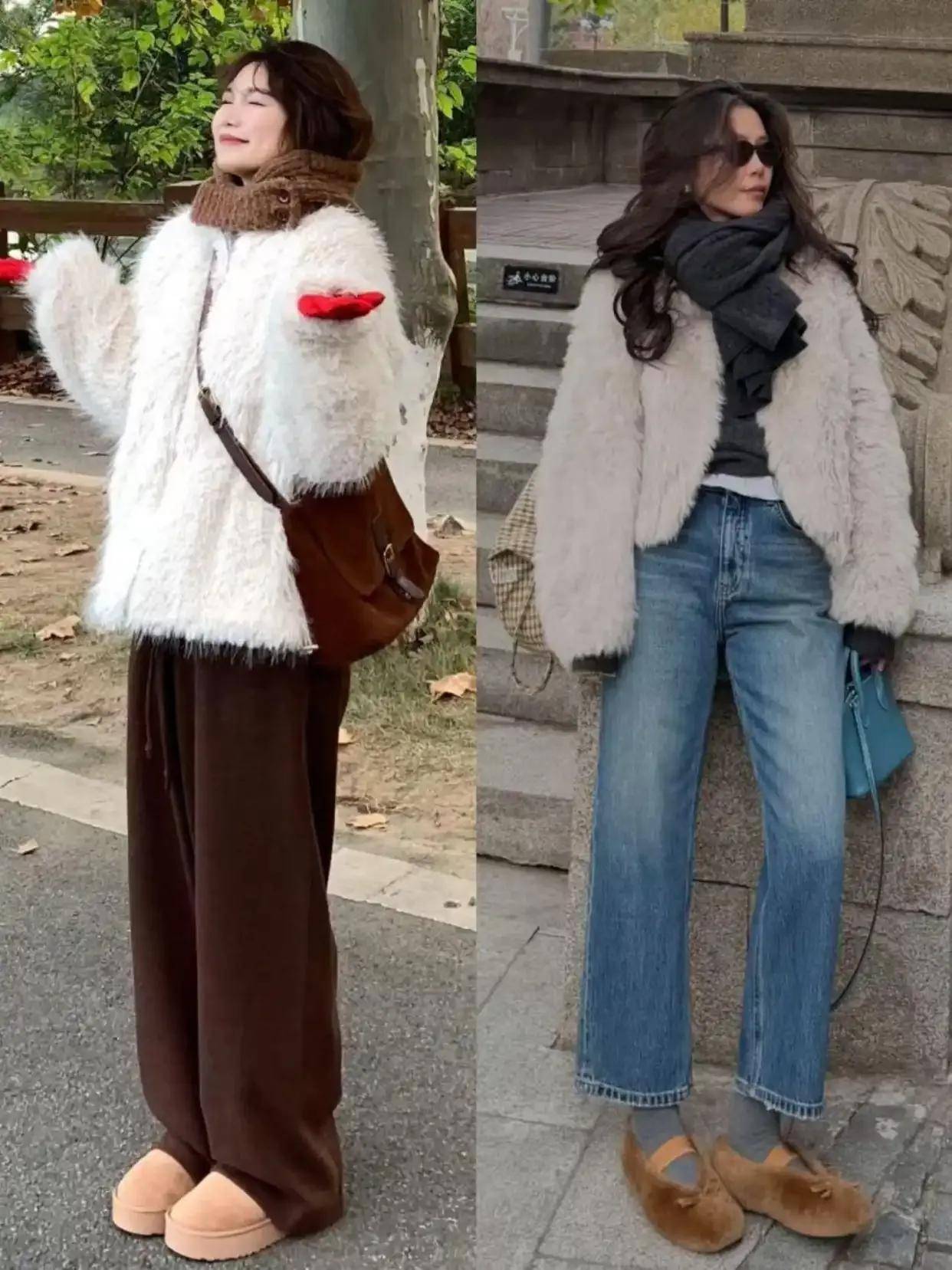 寒冷的冬天很适合穿皮草外套,穿在身上就很显贵。像上面这两件短款的白色皮草,搭配上棕色阔腿长裤,牛仔直筒九分裤,脚上穿了一双勃肯鞋,就能轻松 get 到高贵气质。