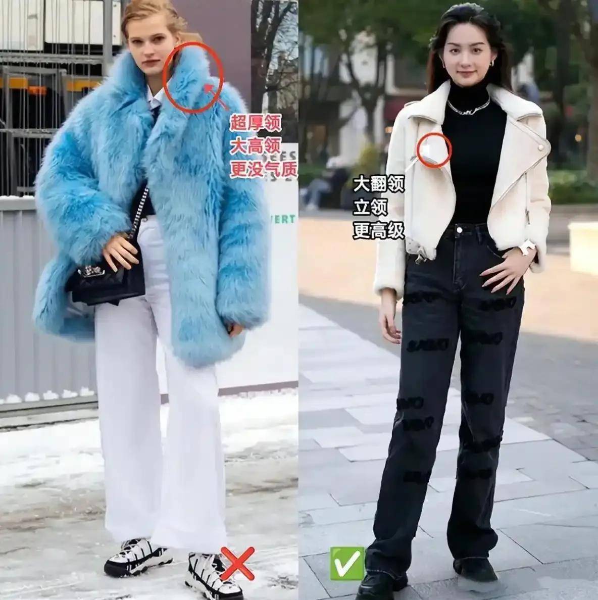 本身你的裤子还挺时尚的,但就是因为选择了超厚领和大高领的外套,穿在身上整个就瞬间没有气质。